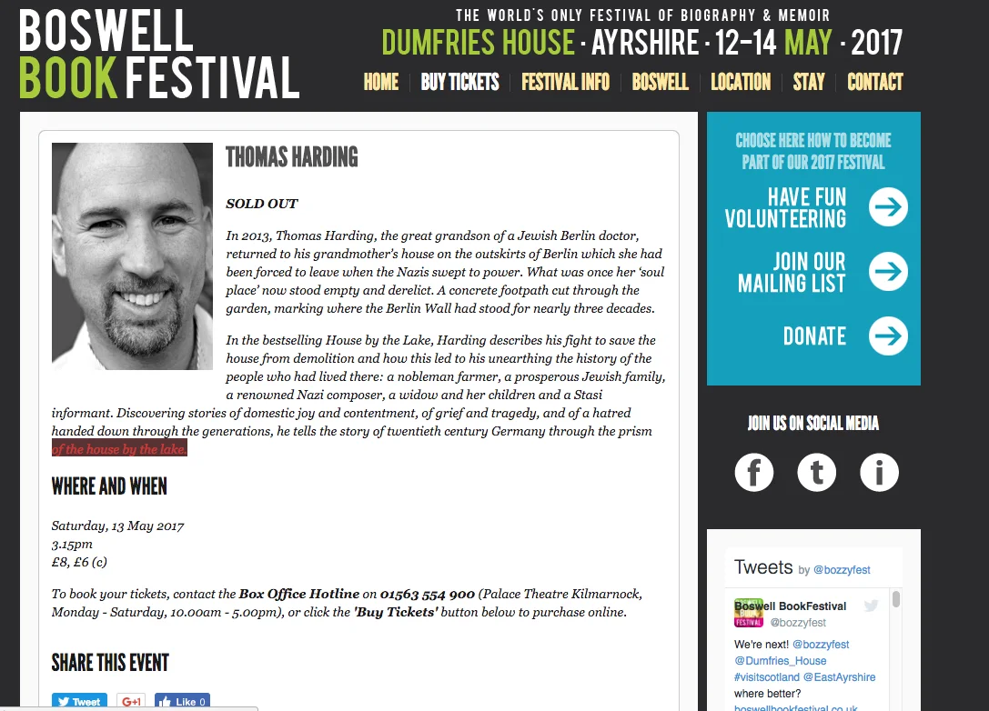 In the bestselling House by the Lake, Harding describes his fight to save the house from demolition and how this led to his unearthing the history of the people who had lived there: a nobleman farmer, a prosperous Jewish family, a renowned Nazi composer, a widow and her children and a Stasi informant. Discovering stories of domestic joy and contentment, of grief and tragedy, and of a hatred handed down through the generations, he tells the story of twentieth century Germany through the prism of the house by the lake.